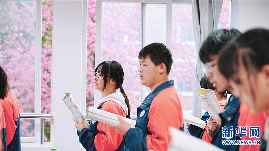 云南安宁昆钢一中,孩子们在教室里读书,窗外樱花盛开(3月17日摄)。新华网发(安宁市教育体育局 供图)