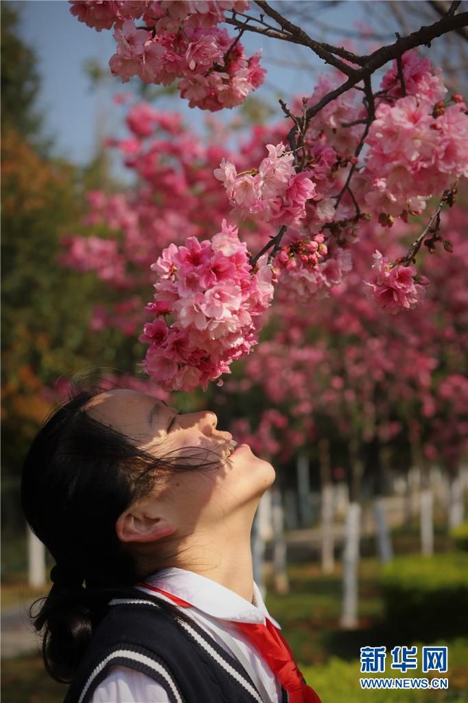 云南安宁,孩子在樱花树下玩耍(3月10日摄)。新华网发(安宁市教育体育局 供图)