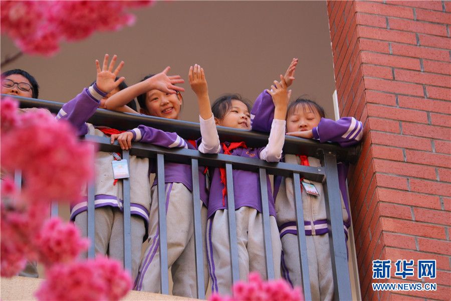 云南安宁,孩子们在樱花掩映中玩耍(3月10日摄)。新华网发(安宁市教育体育局 供图)