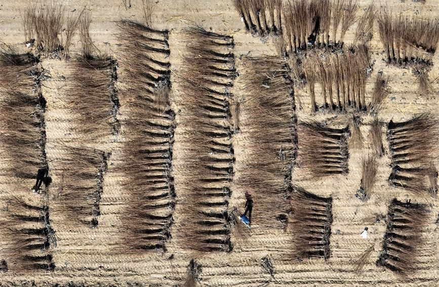 焉耆县七个星镇的村民对沙枣苗进行打包。确·胡热摄
