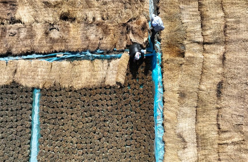 村民对树苗进行泼水遮阳作业。确·胡热摄