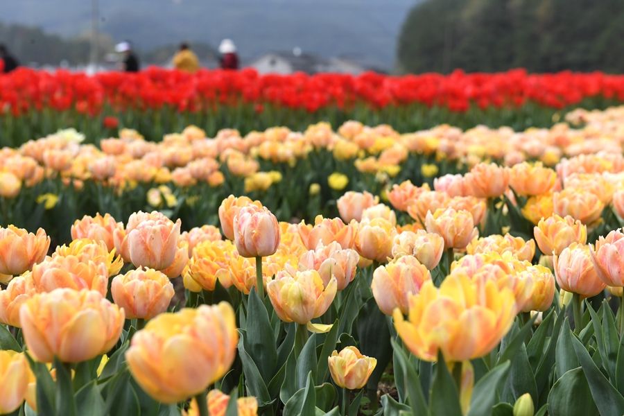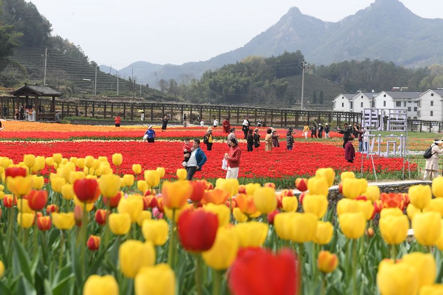 近日,浙江省金华市浦江县杭坪镇乌浆村100亩郁金香盛开,吸引不少游客前来观赏。这片闲置土地由回乡创业的乡贤开发,打造成花海,免费向游客开放,这里还提供鲜切花订购服务,帮助周边农户增收。新华社记者 翁忻旸 摄