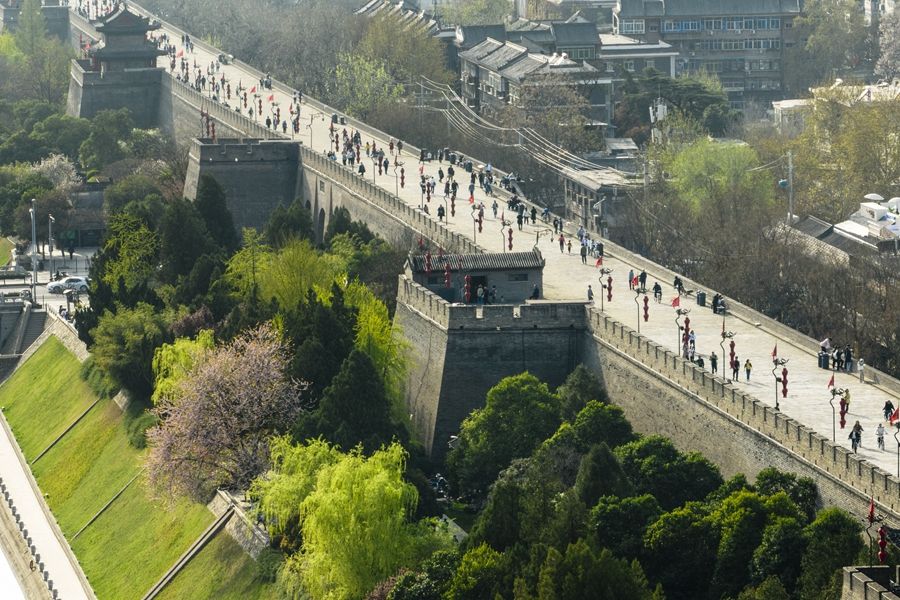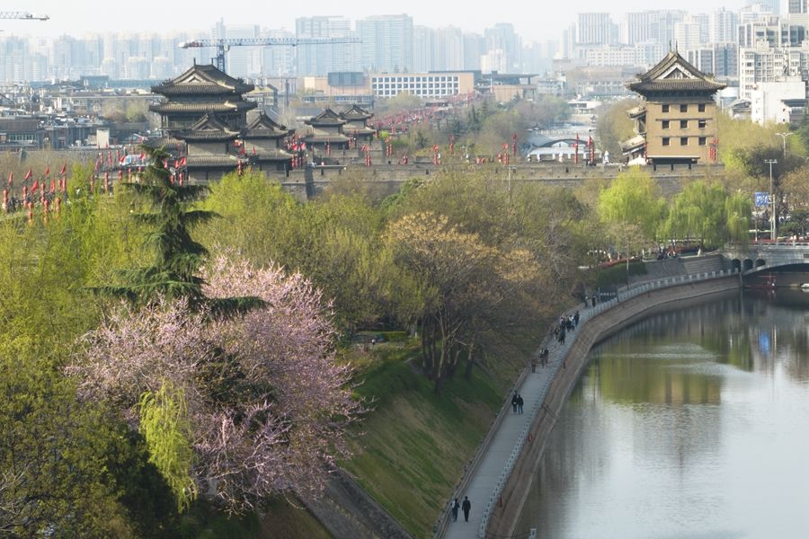 近日,陕西西安明城墙旁春意渐浓,吸引不少市民游客前来踏青。新华社记者 邵瑞 摄
