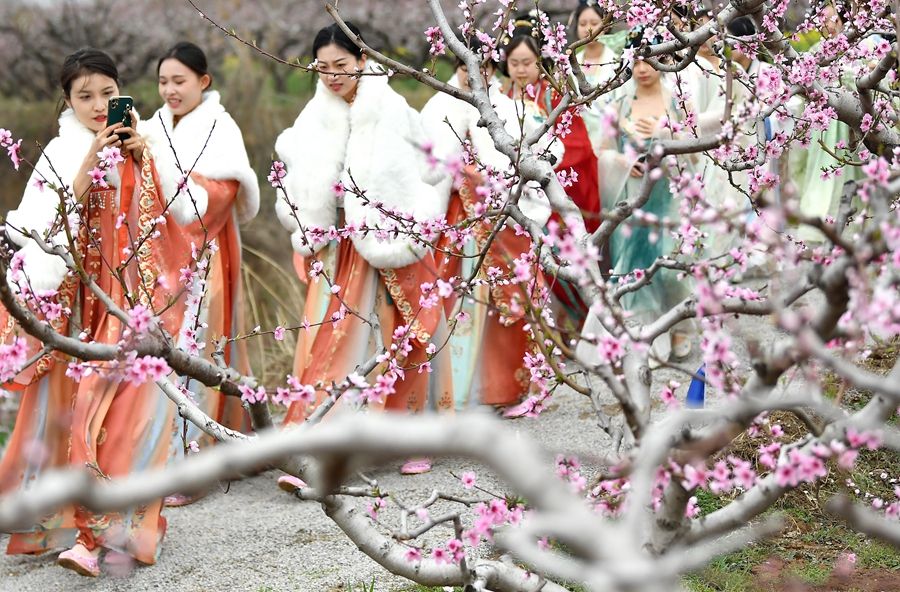 3月24日,在陕西省西安市临潼区零口街道零塬村,汉服爱好者穿行于桃园中。新华社记者 刘潇 摄