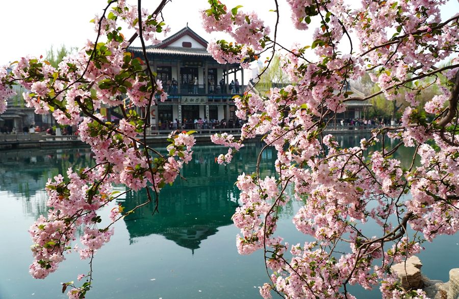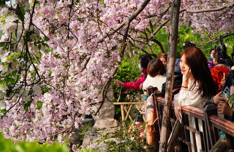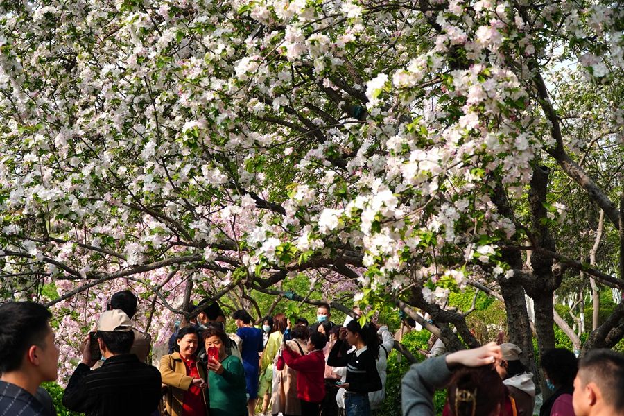 3月21日,在济南市五龙潭公园,人们在观赏盛开的海棠花。新华社记者 徐速绘 摄