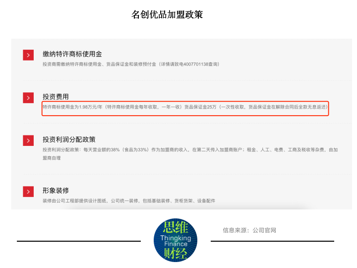 为吸引更多加盟商,名创优品对加盟商的加盟费用也在调整。据多家媒体报道,此前,公司对加盟商收取的特许商标使用金及货品保证金分别为8万、75万元,但根据公司官网显示,这两项费用分别显示为1.98万元、25万元。