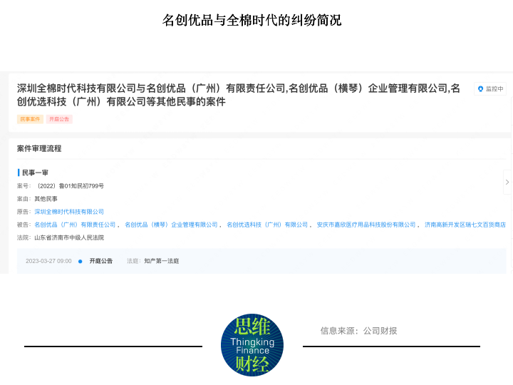 根据企查查,2022年6月,全棉时代新增开庭公告,被告为名创优品、名创优品(横琴)企业管理有限公司、安庆市嘉欣医疗用品科技股份有限公司、济南高新开发区瑞七文百货商店等,案由为擅自使用他人有一定影响的商品名称、包装、装潢纠纷。最新的开庭公告显示,案件已于2023年3月27日在山东省济南市中级人民法院开庭。