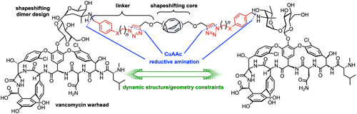使用曾获诺贝尔奖的“点击化学”技术,摩西团队创造了一种新的抗生素,它有两个万古霉素“弹头”和一个波动的牛瓦烯中心。