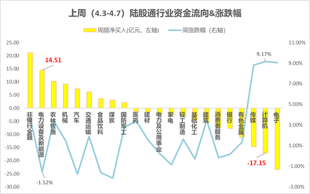 而从上周(4.3-4.7)北向资金走势上看,主打一个“高抛低吸”。电力设备及新能源板块股价表现不佳,但获资金北向资金净流入超14亿元,为全市场第二。(中信以及行业口径)