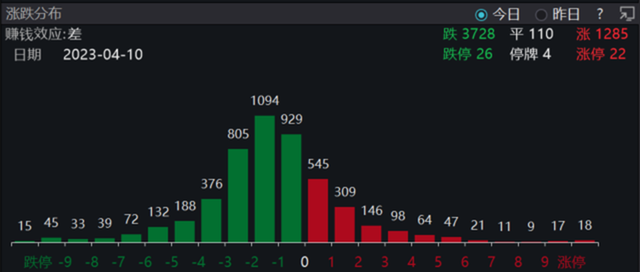 整体赚钱效应其实比较差。3728只个股收跌,1285只收涨。