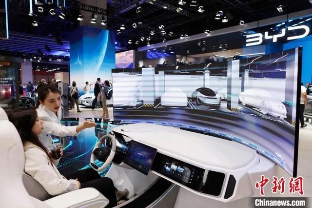 参观者在比亚迪展台体验模拟驾驶。殷立勤 摄