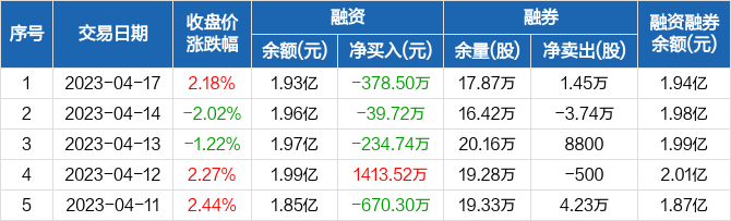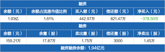 融资方面,当日融资买入442.97万元,融资偿还821.47万元,融资净偿还378.5万元,连续3日净偿还累计652.97万元。融券方面,融券卖出1.75万股,融券偿还3000股,融券余量17.87万股,融券余额159.21万元。融资融券余额合计1.94亿元。