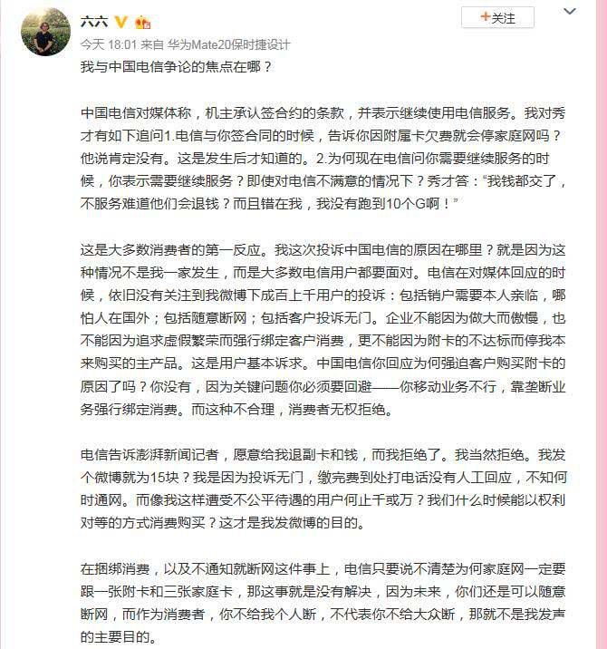 六六谈到,电信告诉媒体记者,愿意给自己退副卡和钱,自己拒绝了:“我发个微博就为15块?我是因为投诉无门,缴完费到处打电话没有人工回应,不知何时通网。而像我这样遭受不公平待遇的用户何止千或万?我们什么时候能以权利对等的方式消费购买?这才是我发微博的目的。”
