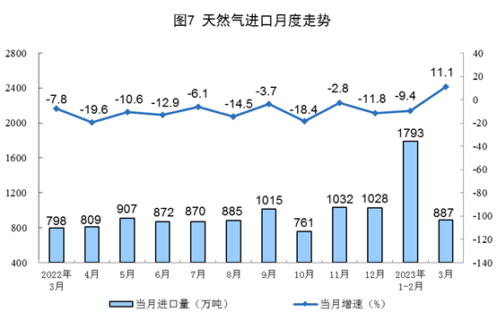 天然气生产有所放缓,进口由降转增。3月份,生产天然气205亿立方米,同比增长4.0%,增速比1~2月份放缓2.7个百分点,日均产量6.6亿立方米。进口天然气887万吨,同比增长11.1%,1~2月份为下降9.4%。