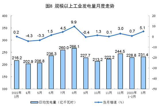 电力生产增速加快。3月份,发电7173亿千瓦时,同比增长5.1%,增速比1~2月份加快4.4个百分点,日均发电231.4亿千瓦时。1~3月份,发电20712亿千瓦时,同比增长2.4%。