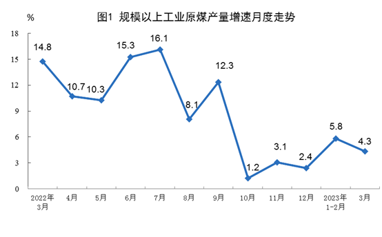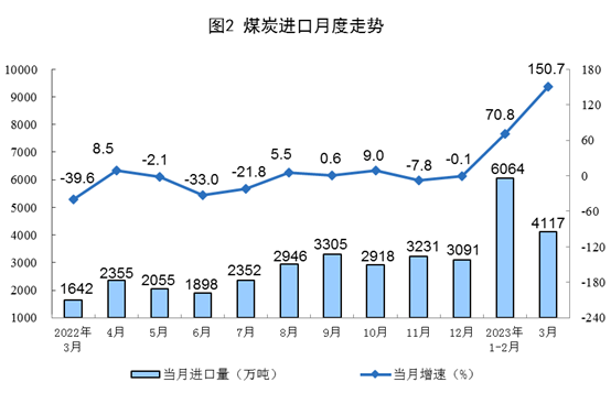 原煤生产稳定增长,进口大幅增加。3月份,生产原煤4.2亿吨,同比增长4.3%,增速比1~2月份放缓1.5个百分点,日均产量1346万吨。进口煤炭4117万吨,同比增长150.7%,增速比1~2月份加快79.9个百分点。