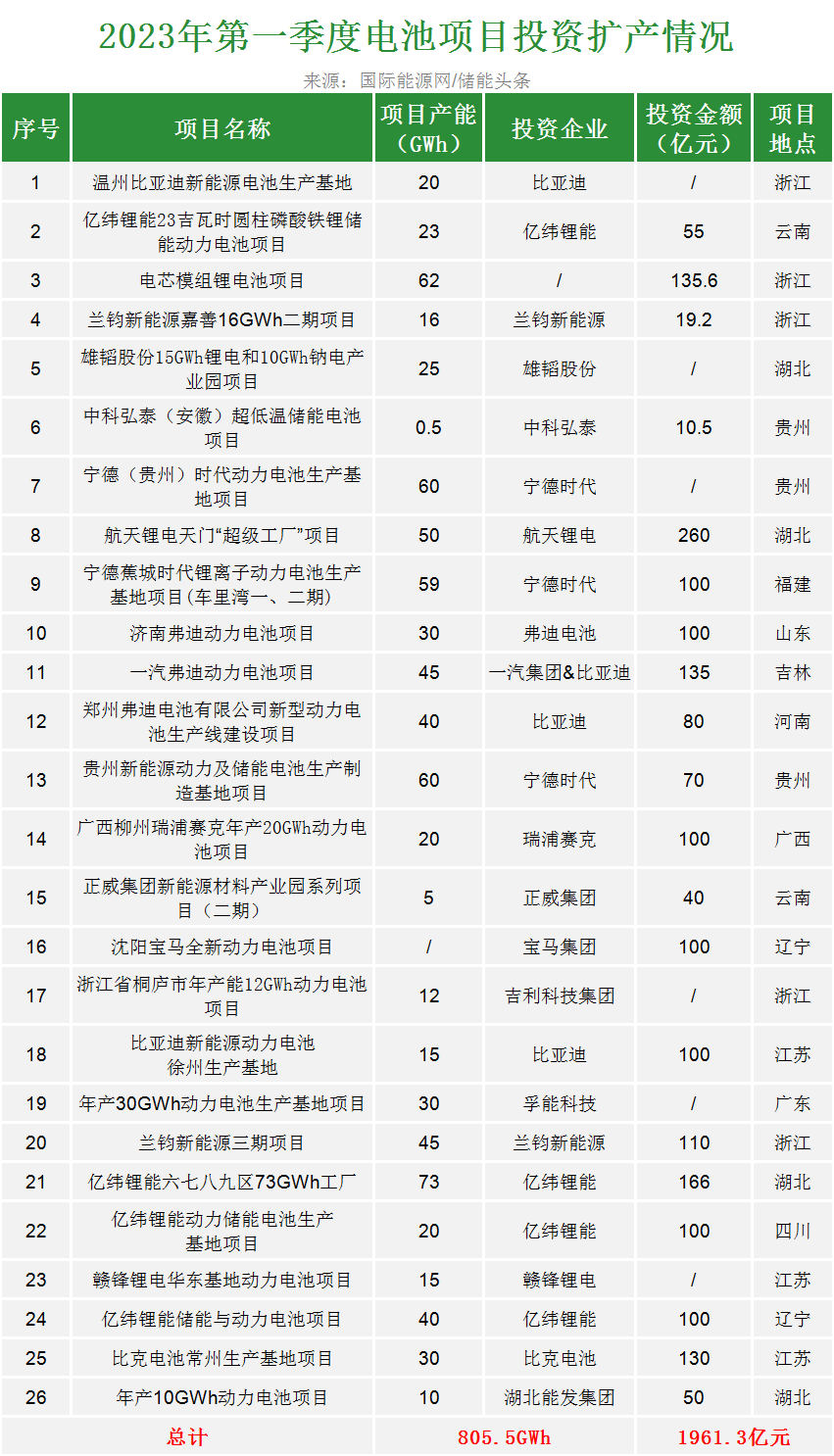 据 国际能源网/储能头条(chuneng365)统计,2023年第一季度,以宁德时代、比亚迪、亿纬锂能、孚能科技、赣锋锂电等为代表的锂电池企业相继公 布了多个新投建项目,整体投建资金超1961.3亿元,建设年产能达805.5GWh(部分项目未披露投资金额及产能)。
