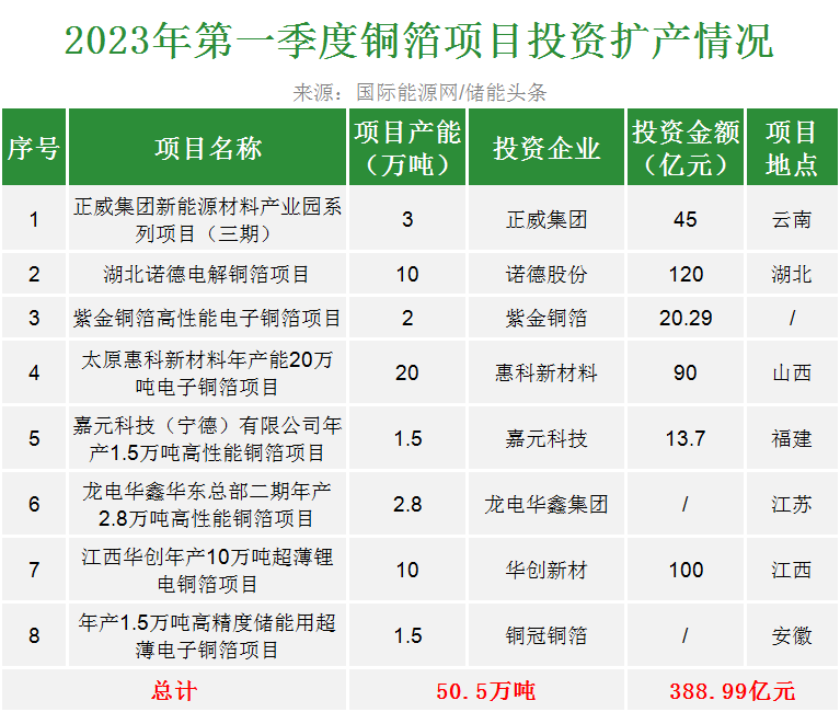 当前,主流铜箔企业均在加码扩产。据国际能源网/储能头条(chuneng365)统计,今年第一季度以来包括诺德股份、嘉元科技、华创新材等企业合计投资超388.99亿元扩产,最终产能达50.5万吨。