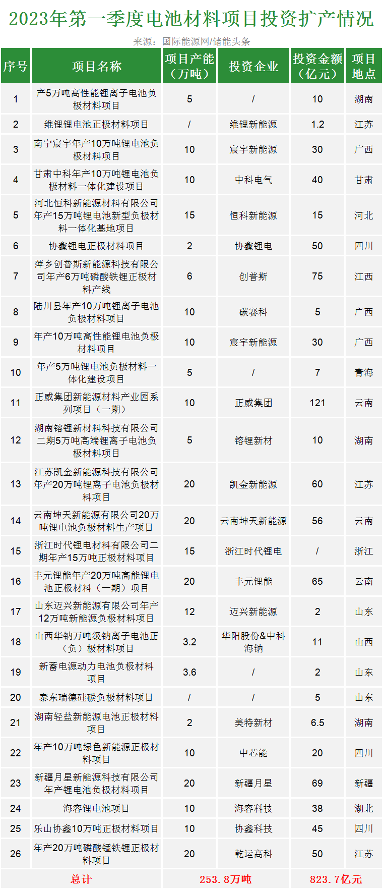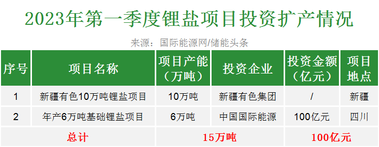 据国际能源网/储能头条(chuneng365)统计,今年第一季度以来包括新疆有色、中国国际能源等企业合计投资超100亿元扩产锂盐项目,产能达15万吨。