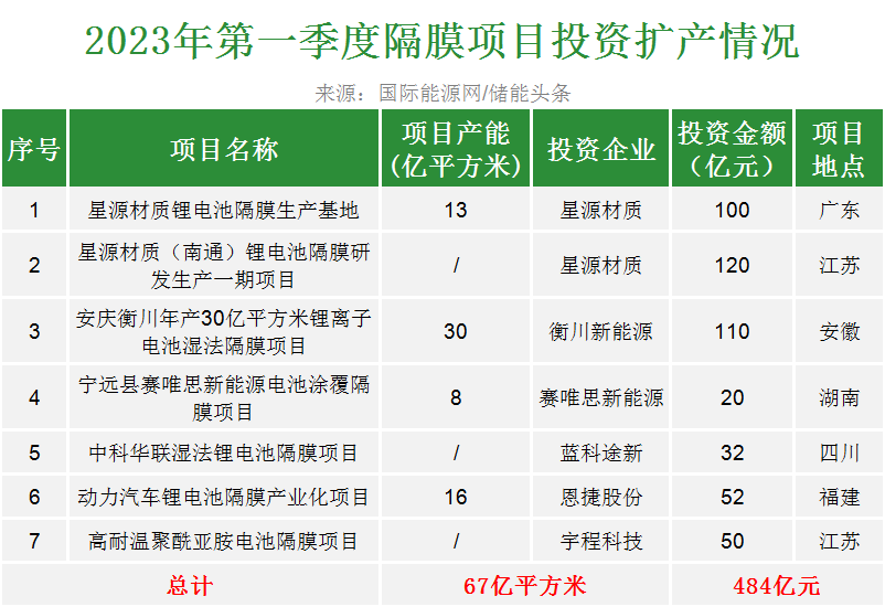 进入2023年,锂电池隔膜领域的投资热度依旧不减,衡川新能源、星源材质、恩捷股份等产业链企业接连落地新项目,投资总额超484亿元。