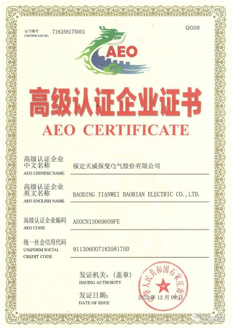 近日,保变电气(600550)收到中华人民共和国石家庄海关颁发的“AEO高级认证”证书,该认证是世界多国海关认可的最高信用等级资质,被公认为全球贸易的“绿色通行证”。