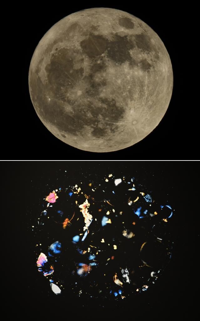这是一张拼版照片,上图为2022年6月14日拍摄的“超级月亮”(新华社发 胡攀学摄);下图为2023年4月19日拍摄的展出中的月壤颗粒正交偏光显微照片。新华社发