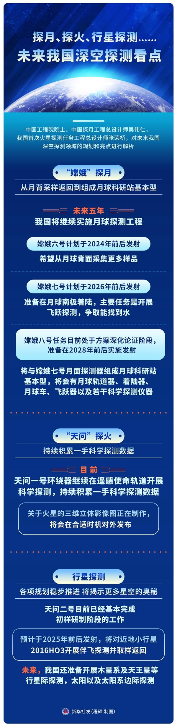 4月24日是第八个“中国航天日”,在安徽合肥主场活动上发布的我国首次火星探测相关成果受到广泛关注。目前,我国已成功实施嫦娥一号至嫦娥五 号任务,实现探月工程“绕、落、回”战略规划的圆满收官;实施首次火星探测天问一号任务,一步实现对火星的“环绕、着陆、巡视”探测。我国在深空探测领域 有哪些最新成果?未来还将实施哪些重点工程?
