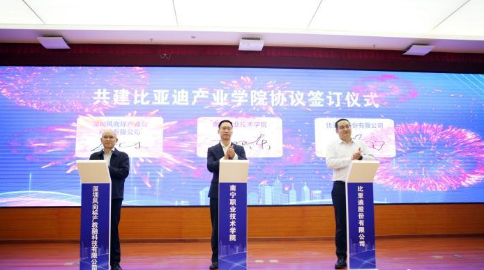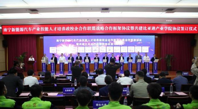 当天,比亚迪公司与南宁市人力资源和社会保障局、南宁市工业和信息化局、南宁市教育局以及南宁职业技术学院、广西职业技术学院等广西10所职业院校共同签署战略合作协议,共同建立“南宁新能源汽车产业技能人才培养政校企合作联盟”,并与南宁职业技术学院、广西南宁技师学院等签订校企合作协议,确定了在南宁建设比亚迪产业学院的工作计划与布局。