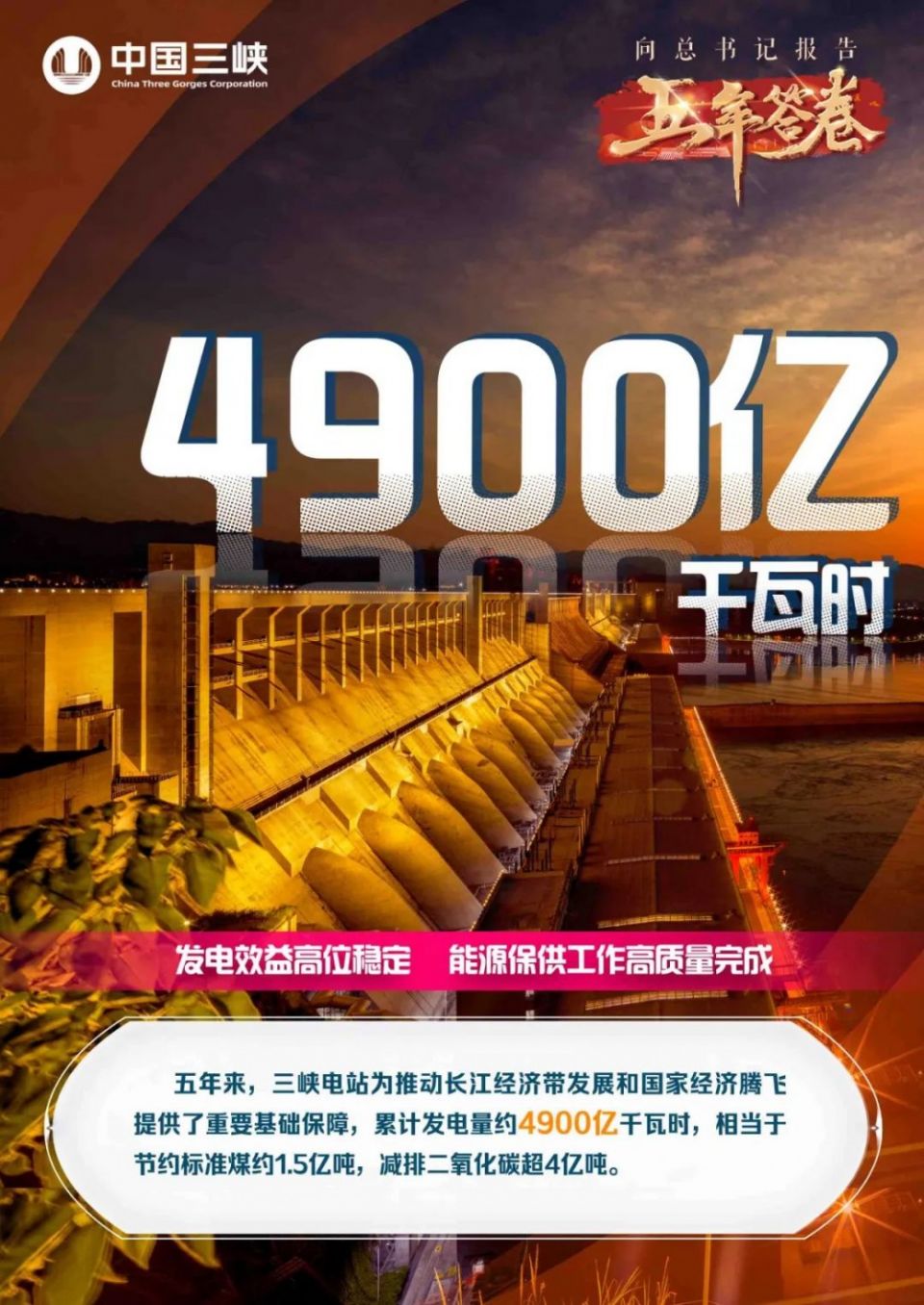 五年来,三峡电站充分发挥能源保供“压舱石”和“稳定器”作用,累计完成中国共产党成立一百周年、中华人民共和国成立七十周年、党的二十大、北京冬奥会等重大保电任务超40次。2022年8月,三峡电站积极响应保供需求,日调峰量最高达900万千瓦,全力释放保供能力。