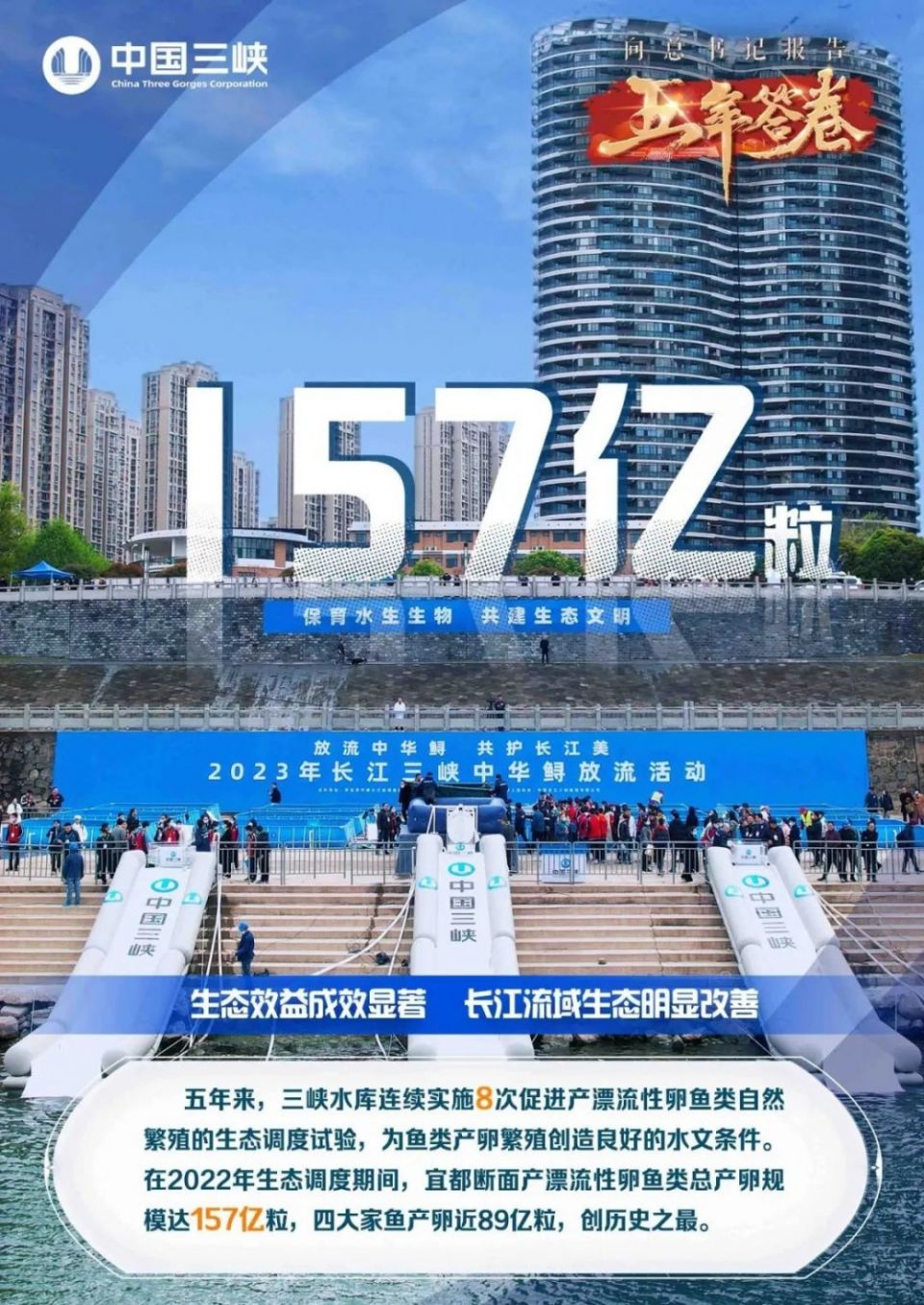 三峡工程是我国重要的生态环境调节器。三峡工程库坝区实施了生态环境保护专项工作,进行水污染防治、天然林保护、长江防护林建设、长江上游水土保持、退耕还林、库周绿化带建设等生态环境保护和建设,打造三峡生态屏障,确保一江清水向东流。连续实施梯级水库生态调度,成为长江大保护事业的“践行者”,有效促进长江鱼类资源增长。
