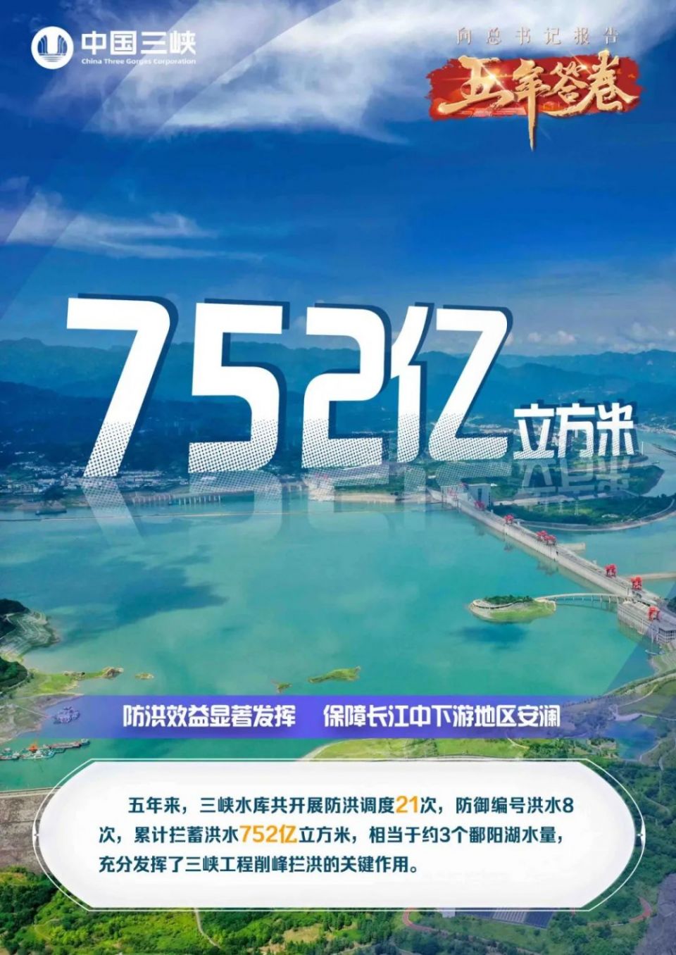 三峡工程作为开发和治理长江的关键性骨干工程,防洪是其首要功能。三峡工程位于长江上游与中下游交界处,紧邻防洪形势最为严峻的荆江河段,防洪库容221.5亿立方米,在长江流域防洪调度中发挥着骨干主力作用。以2020年为例,在迎战2020年“长江第5号洪水”期间,三峡水库将75000立方米每秒的建库以来最大洪峰削减至49400立方米每秒,削峰率超过1/3,宜昌站约40年一遇的大洪水被削减为常遇洪水,成功避免荆江分洪区运用和60万人转移、49万亩耕地被淹,有力保障了人民生命财产安全。