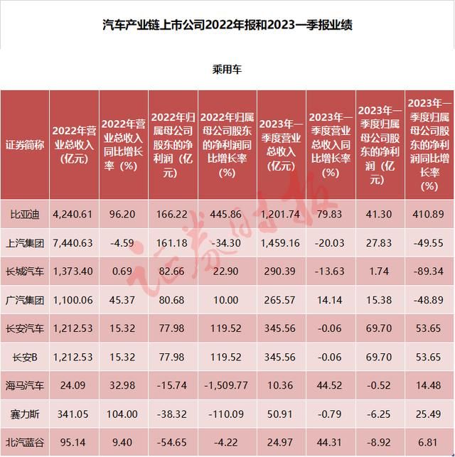 数据显示,A股市场汽车产业链上市公司2022年报和2023年一季报基本已出齐,其中在整车生产企业中,新能源汽车的市场份额不断提升,向以往传统燃油车居主导的车市格局发起有力挑战,龙头公司比亚迪(002594)增长迅猛。
