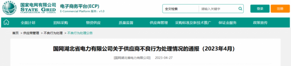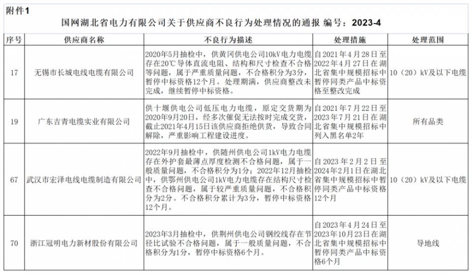 产业资讯 国网湖北电力发布4月不良行为通报 涉及4缆企 2023-05-05 09:57:08 分享 4月27日,国家电网公司电子商务平台发布《国网湖北省电力有限公司关于供应商不良行为处理情况的通报(2023年4月)》。《国网湖北省电力有限公司关于供应商不良行为处理情况的通报(2023年4月)》显示,无锡市长城电线电缆有限公司、广东吉青电缆实业有限公司、武汉市宏泽电线电缆制造有限公司、浙江冠明电力新材股份有限公司等4家线缆企业在列(具体处理情况表附后)。