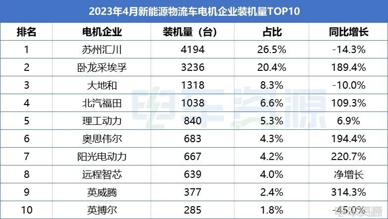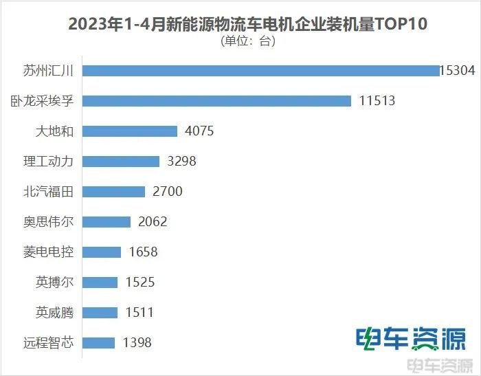 据数据显示,2023年前4月新能源物流车电机装机量TOP3企业依然是苏州汇川、卧龙采埃孚、大地和。