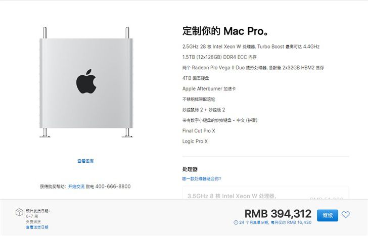 目前开售的只有Mac Pro塔式47999元起,当然这只是最基础的起步配置,如果是真土豪配满了该多少钱呢?苹果官网可以选择顶级配置。总花费需要394312元,支持24期免息,每月仅约RMB 16430元。