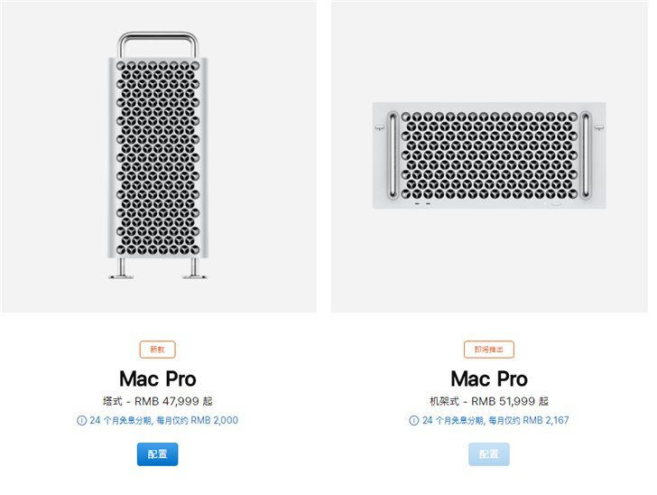 12月11日消息 苹果官网今天正式上架了新款Mac Pro,其中塔式47999元起,现在开售,6-7周内到货。机架式51999元起,即将发售,两款都支持24期免息,最低版本分期后每月仅2000元。