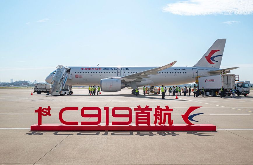 产业资讯 国产大飞机C919圆满完成商业航班首飞 2023-05-29 08:20:12 分享 2023年5月28日,国产大飞机C919迎来商业航班首飞。2023 年5月28日,由国产大飞机C919执飞的中国东方航空MU9191航班从上海虹桥机场起飞,在北京首都机场平稳降落,穿过象征民航最高礼仪的“水门”, 顺利完成这一机型全球首次商业载客飞行。当天,近130名首航旅客“抢鲜”感受了C919带来的空中之旅。该航班标志着C919的“研发、制造、取证、投 运”全面贯通,中国民航商业运营国产大飞机正式“起步”,中国大飞机的“空中体验”正式走进广大消费者。王初摄(人民图片网)