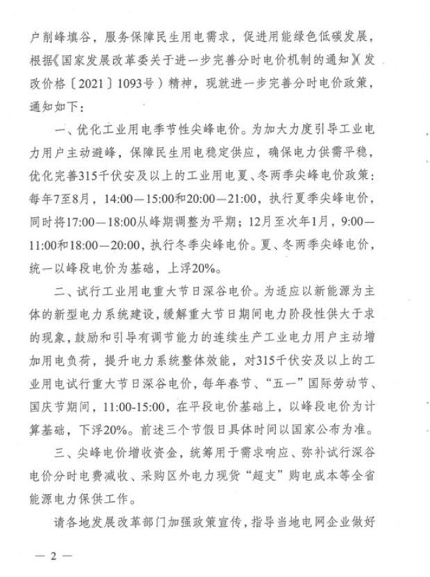 一、优化工业用电季节性尖峰电价。为加大力度引导工业电力用户主动避峰,保障民生用电稳定供应,确保电力供需平稳,优化完善315千伏安及以上的工业用电夏、冬两季尖峰电价政策:每年7至8月,14:00-15:00和20:00-21:00,执行夏季尖峰电价,同时将17:00-18:00从峰期调整为平期;12月至次年1月,9:00-11:00和18:00-20:00,执行冬季尖峰电价。夏、冬两季尖峰电价,统一以峰段电价为基础,上浮20%。