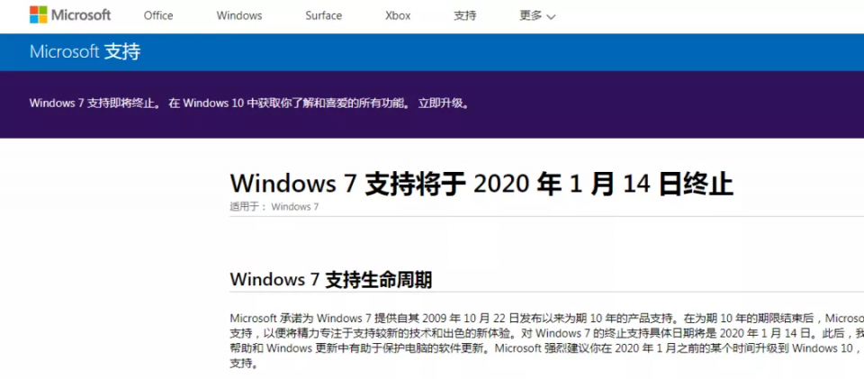 在官网一则简短的声明中,微软称:“2020年1月14日之后,微软将不再为安装Windows 7的电脑提供安全升级或支持。立即升级到Windows 10,以保持您的员工的生产力和安全。”