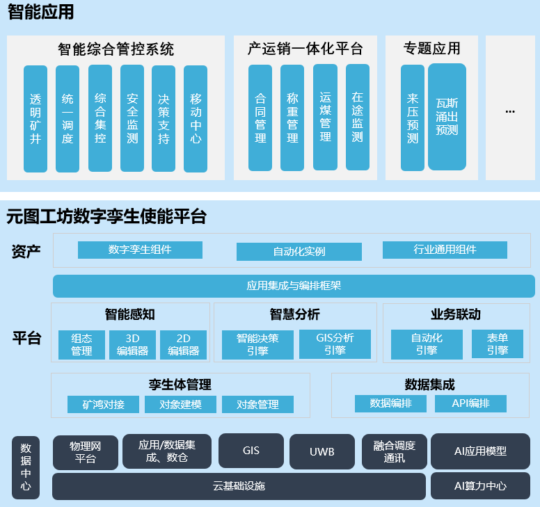 其设计理念为平台提供“炒菜原料”和“炒菜流程”,让伙伴能适配煤矿需求“做菜”。元图工坊创新地通过统一数据建模,构建数据驱动的数字孪生平台,配套低代码应用集成工具链,使能伙伴高效开发应用。