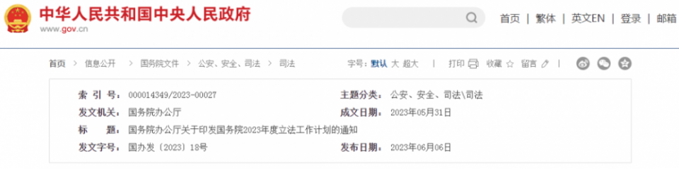 6月6日,国务院办公厅关于印发《国务院2023年度立法工作计划》的通知。