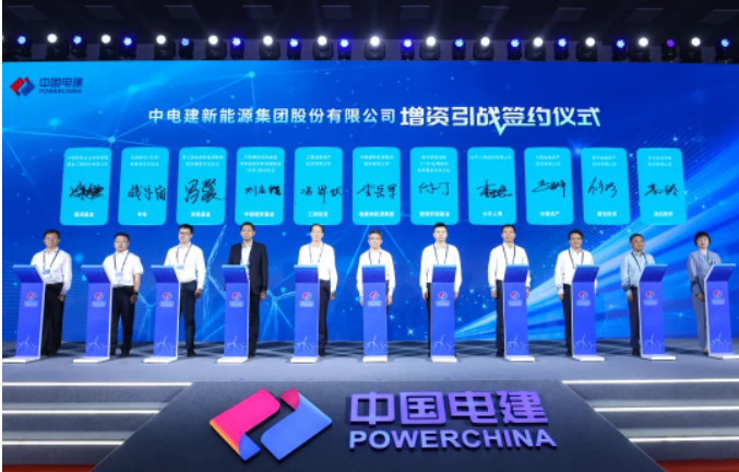 仪式上,中国电建总经济师兼电建新能源集团董事长刘明江作了发言,电建新能源集团党委书记、总经理、法定代表人李岳军与南网双碳基金、工银投资、太平人寿、中银资产、中国中车等10家战略投资人代表共同签署增资协议。