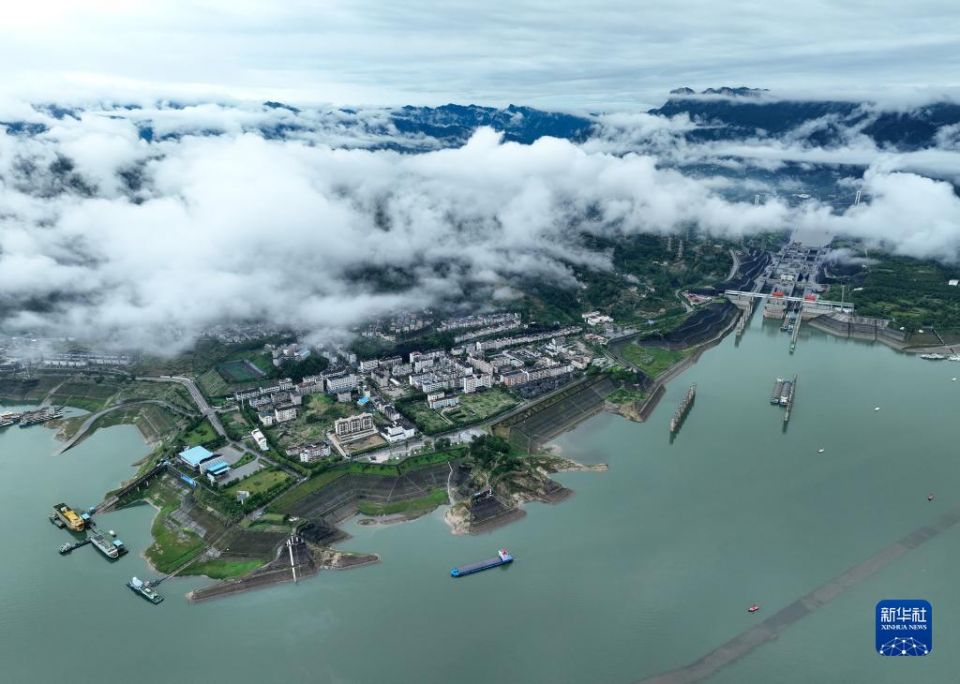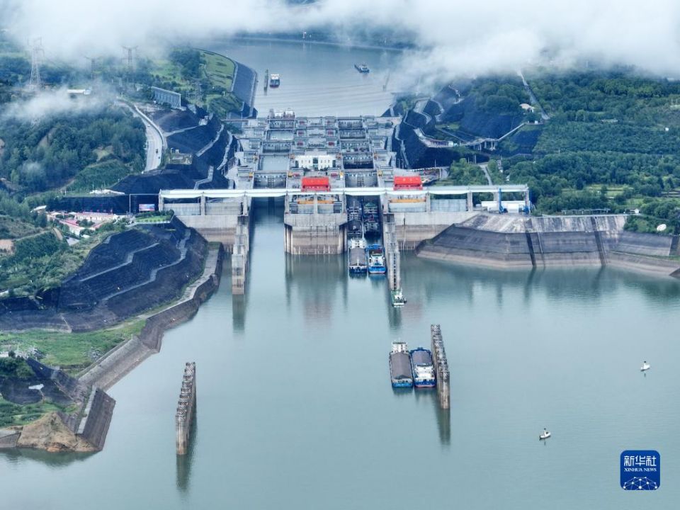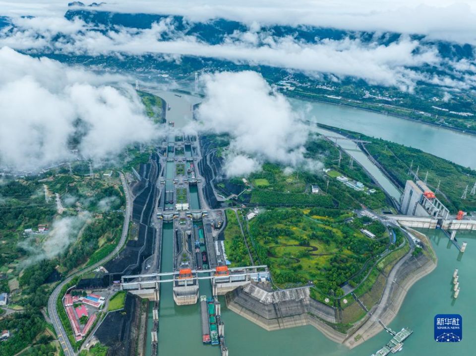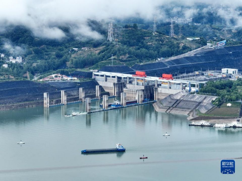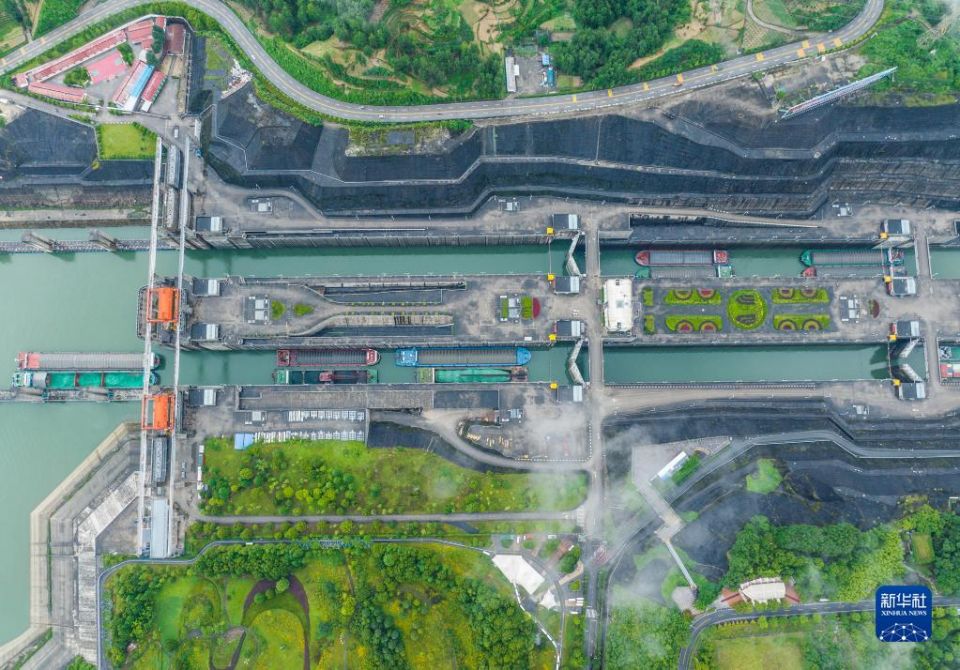 6月18日,船舶有序通过三峡船闸和升船机(无人机照片)。新华社发(王罡摄)