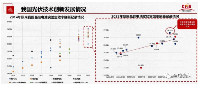 根 据中国光伏行业协会,2014年起,我国企业/研究机构晶硅电池实验室效率已打破纪录56次;2022年,我国企业/研究机构刷新效率纪录14次,其中 10次为n型电池技术;由隆基绿能自主研发的硅异质结电池转换效率达26.81%,创下目前全球硅基太阳能电池效率的最高记录;同时,无论是纯钙钛矿电 池、无机钙钛矿电池,还是钙钛矿晶硅叠层电池,研发效率都取得了可喜的突破。
