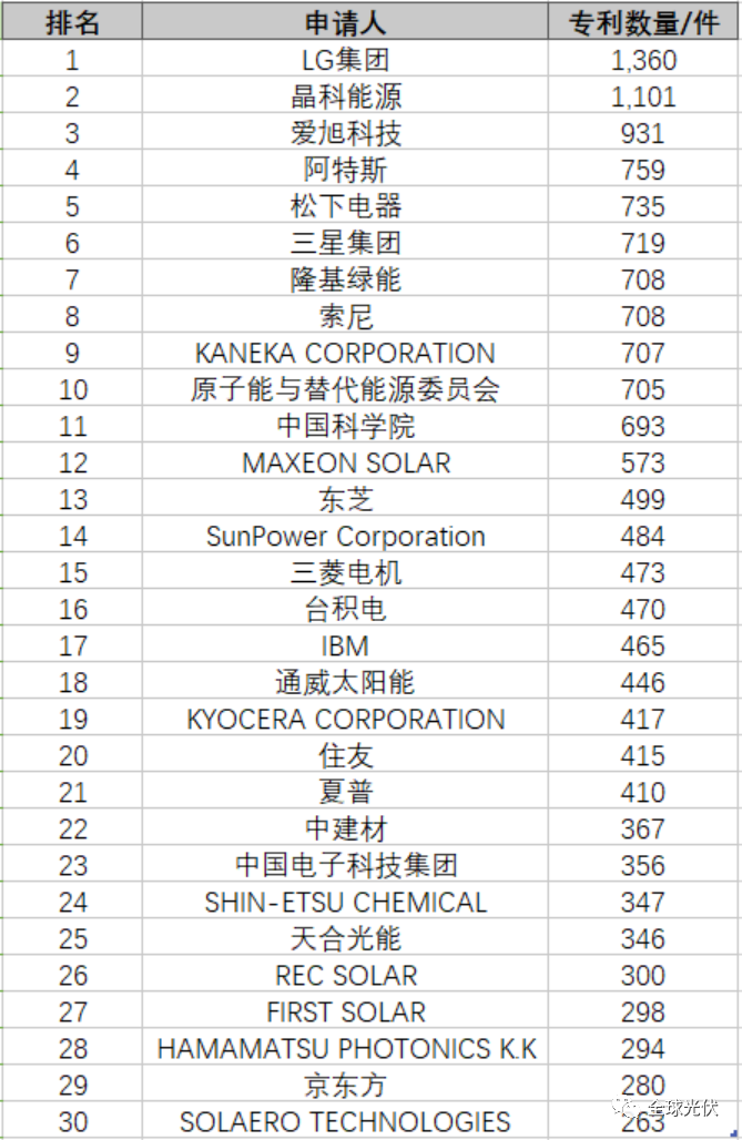 全球太阳能电池片专利排行榜TOP30中,出现了许多非光伏企业的身影,尽管其中有些已经退出相关市场,众多跨国大型企业对光伏业务的涉及仍彰显了光伏行业的欣欣向荣。