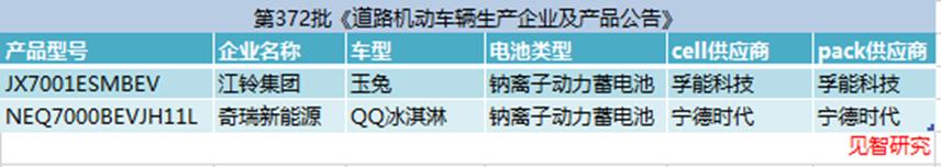 其中搭载三元锂电池的车型有34款,而使用磷酸铁锂电池的车型为36款,最值得关注的是却是剩下来的2款车型——奇瑞新能源的QQ冰淇淋和江铃集团的玉兔,这两款车型装载的是来自宁德时代和孚能科技的钠离子电池。