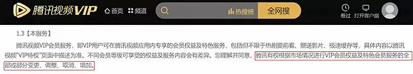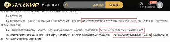 不过,虽然用户感觉自己的会员跟没有一样,但腾讯视频VIP早就在“会员服务协议”中为这些收费点做好了说明,比如有关“广告服务”的权益说明,提醒你就算是VIP会员也要看广告: