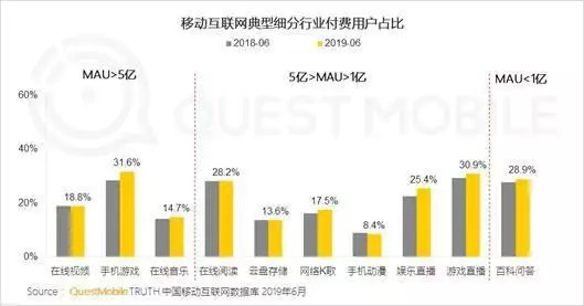 来自QuestMobile《2019付费市场半年报告》的数据也显示,在线视频网站的付费用户比例也在稳步上升,截止到2019年6月,这一占比已经达到了18.8%,爱奇艺、腾讯视频、优酷付费用户活跃率分别为24%、22.6和19.6%,利润成长也比较显著。