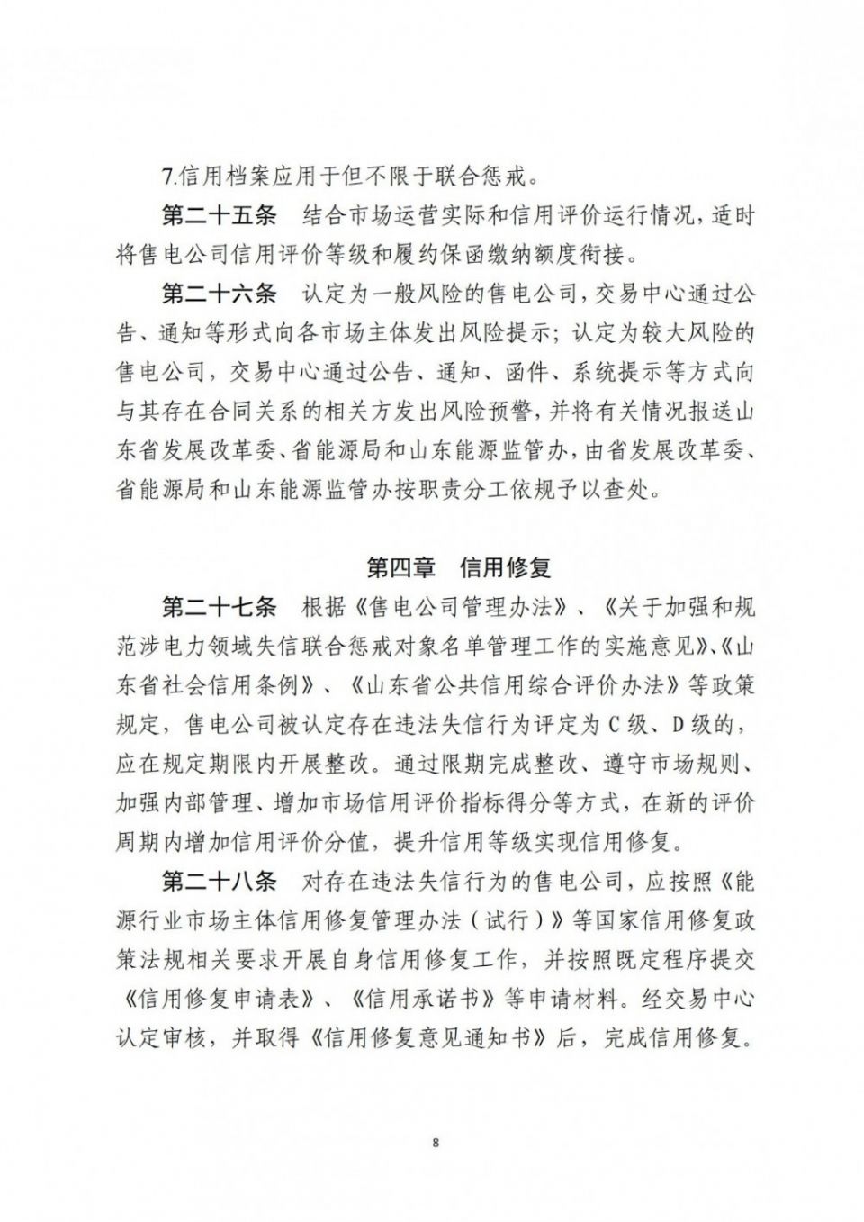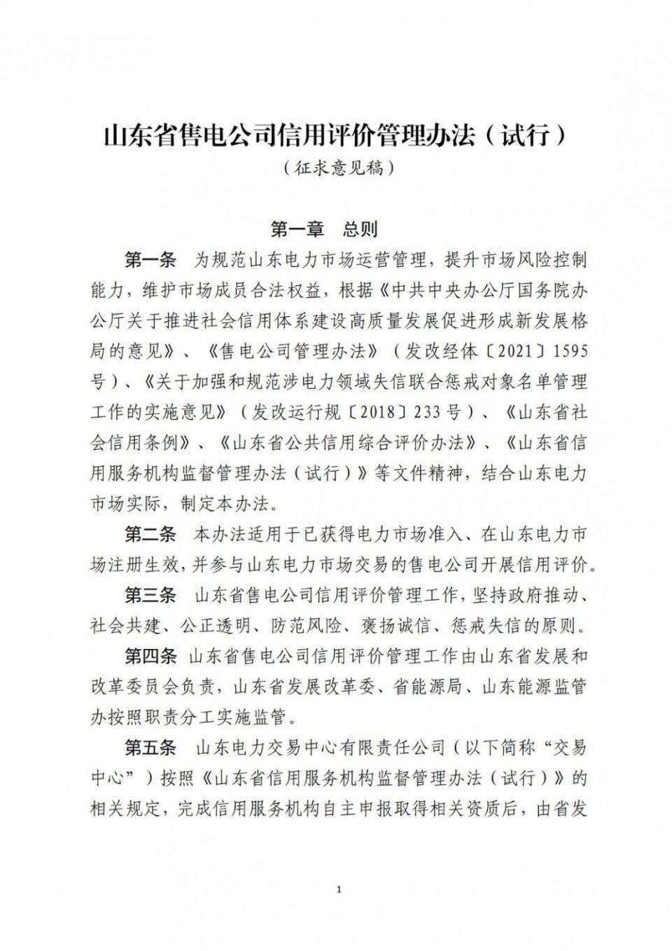 为规范山东电力市场运营管理,提升市场风险控制能力,维护市场成员合法权益,根据《中共中央办公厅国务院办公厅关于推进社会信用体系建设高质量发展促进形成新发展格局的意见》、《售电公司管理办法》(发改经体〔2021〕1595号)、《关于加强和规范涉电力领域失信联合惩戒对象名单管理工作的实施意见》(发改运行规〔2018〕233号)、《山东省社会信用条例》、《山东省公共信用综合评价办法》、《山东省信用服务机构监督管理办法(试行)》等文件精神,结合山东电力市场实际,我委组织编制了《山东省售电公司信用评价管理办法(试行)》,现面向社会公开征求意见建议。