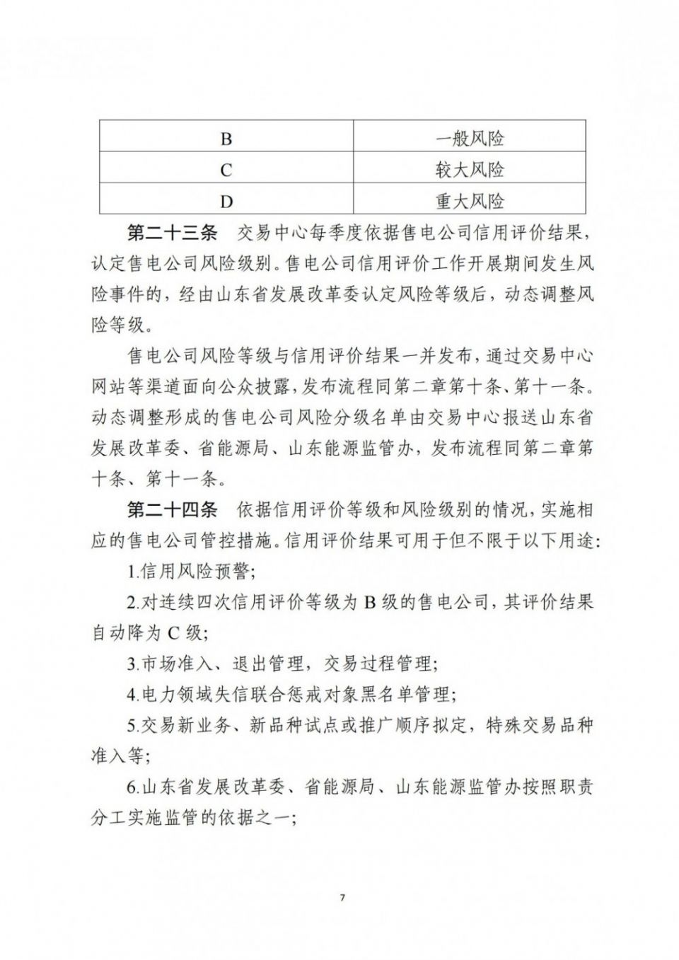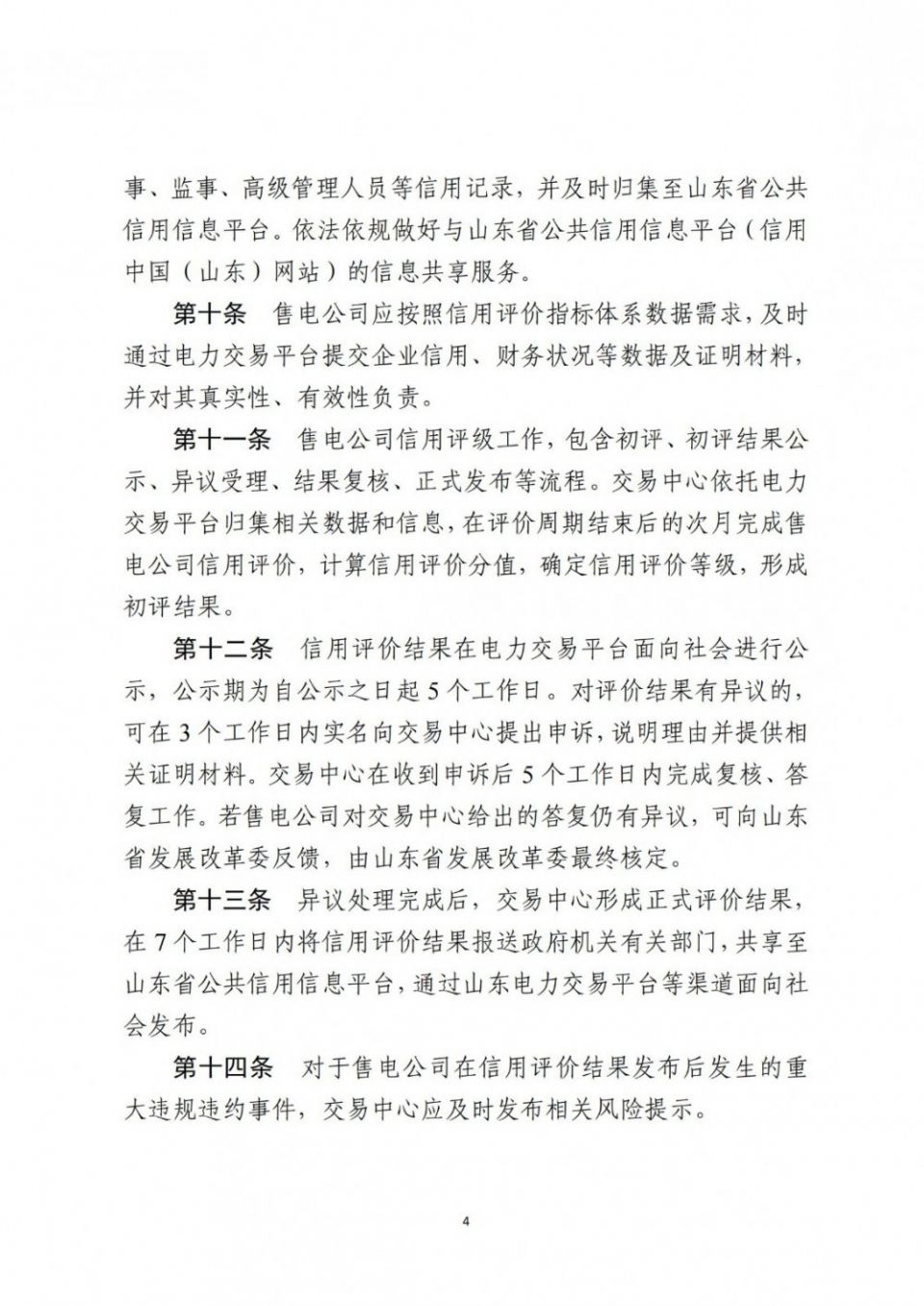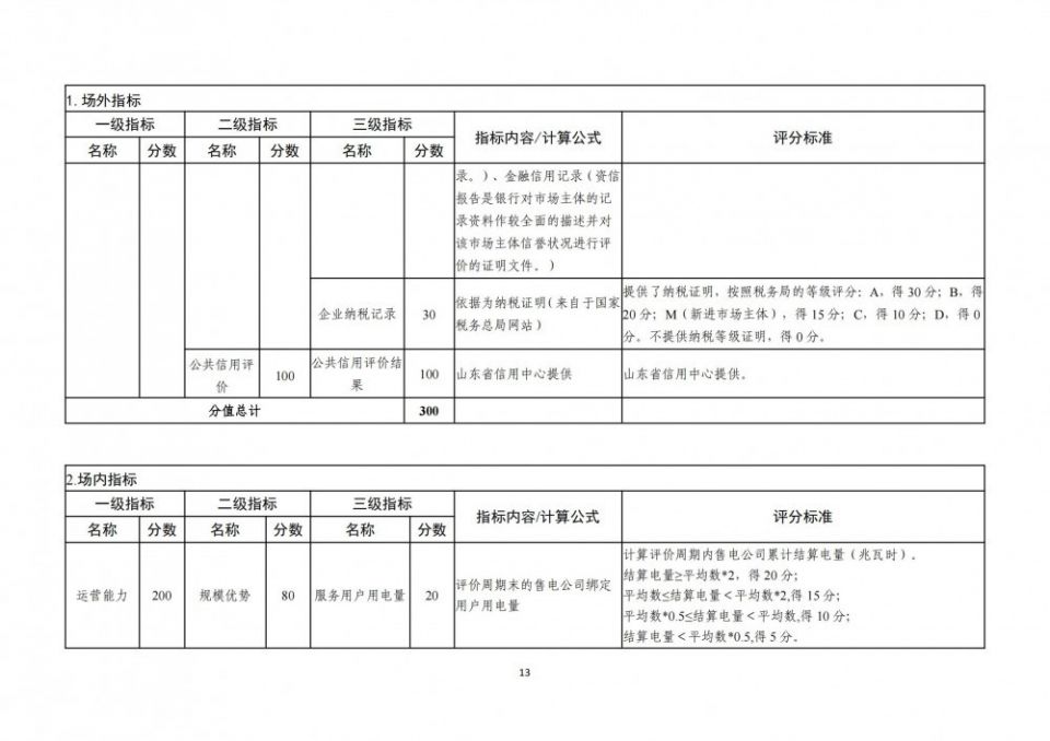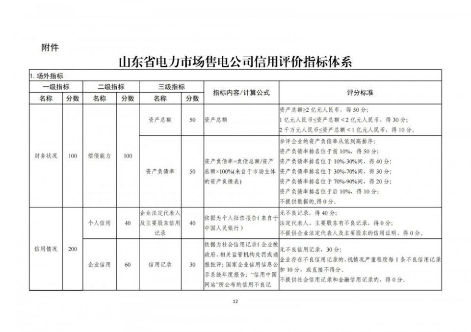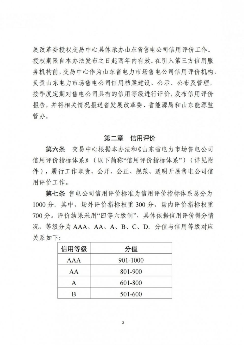 6月25日山东省发改委发布关于征求《山东省售电公司信用评价管理办法(试行)》(征求意见稿)规范性文件意见的通知。通知指出,山东省售电公司信用评价管理工作,坚持政府推动、社会共 建、公正透明、防范风险、褒扬诚信、惩戒失信的原则,由山东省发展和改革委员会负责,山东省发展改革委、省能源局、山东能源监管办按照职责分工实施监管。山东电力交易中心有限责任 公司按照《山东省信用服务机构监督管理办法(试行)》的相关规定,完成信用服务机构自主申报取得相关资质后,由省发展改革委授权其具体承办山东省售电公司信用评价工作。授权期限自 《管理办法》发布之日起两年内有效。开展信用评价的主体为已获得电力市场准入、在山东电力市场注册生效,并参与山东电力市场交易的售电公司。售电公司信用评价标准为《指标体系》, 总分为 1000 分。其中,场外评价指标权重 300 分,场内评价指标权重 700 分。评价结果采用“四等六级制”,具体依据信用评价得分情况,等级分为 AAA、AA、A、B、C、D。